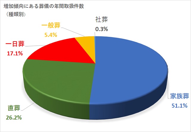 葬儀の形は、多くの参列者をお呼びする一般葬から、ご家族やお身内だけで行う家族葬へと変わりつつあります。平成29年度の、公正取引委員会における葬儀の取引に関する実態調査の統計を見てみましょう。(注1) 増加傾向にある葬儀は家族葬が半数(51.1%)を占め、次に目立つのは直葬(火葬式・26.2%)と一日葬(17.1%)でした。