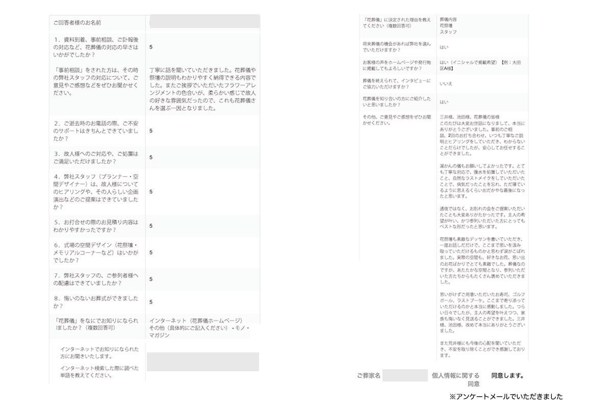 通夜ではなく、お別れの会をご提案いただいたことも大変ありがたかったです。主人の希望が叶い、かつ参列いただいた方にとってもベストな形だったと思います。