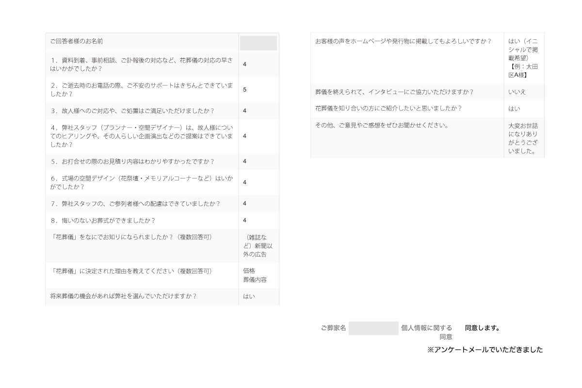 故人から、花葬儀の話を事前に聞いていたので、悲しみのなか迷わずお願いする事が出来ました。葬儀当日は強風でしたが、スタッフの方は嫌な顔もせず遺族に気を配った声掛けをしてくださり感謝しております。故人に最後の贈り物として沢山の花を手向ける事が出来たので、救われた様な気持ちになりました。本当にお世話になりました。