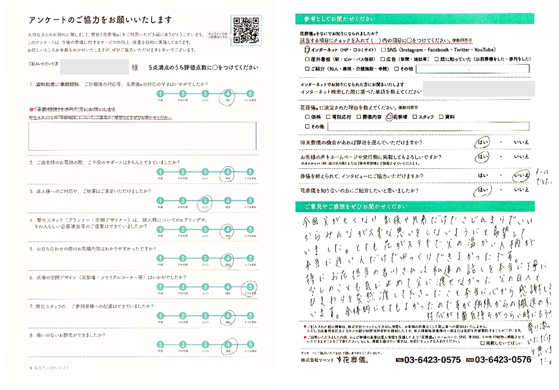 この度は母の葬儀に際し大変お世話になりました。無事に当日を迎えられたのは花葬儀さんのお陰だと思っています。
