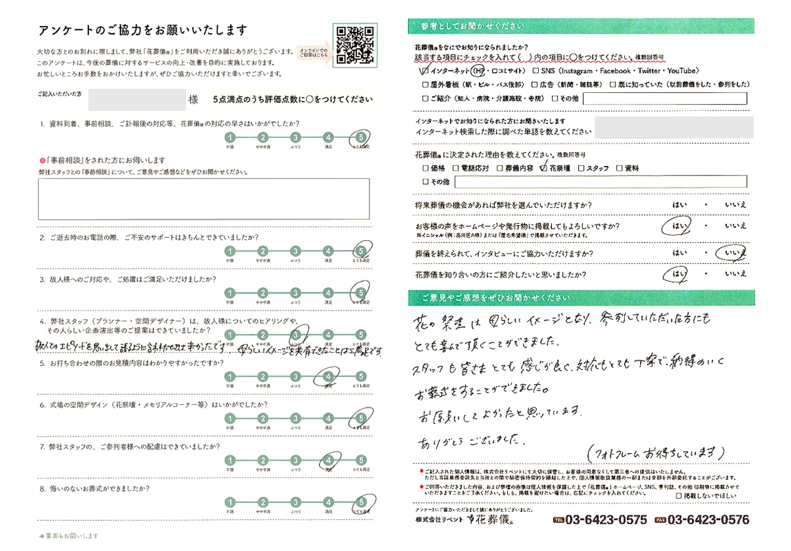花の祭壇は母らしいイメージとなり、参列して頂いた方にもとても喜んで頂くことができました。スタッフの皆さまもとても感じが良く、対応もとても丁寧で、納得のいくお葬式をすることができました。お願いして良かったと思ってます。ありがとうございました。
