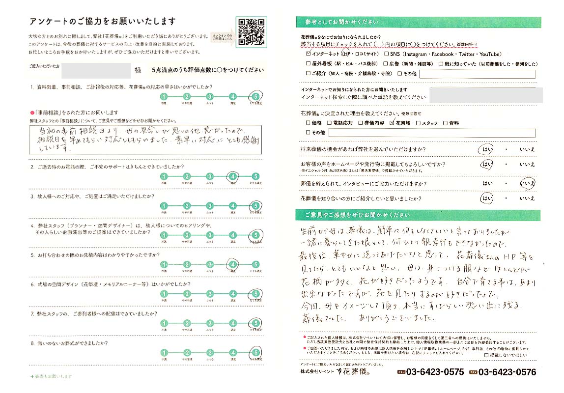 華やかで美しい葬儀をしていただきありがとうございました。