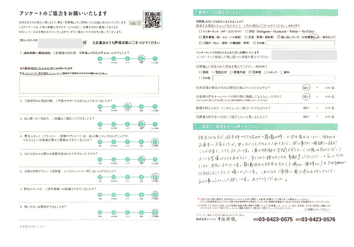 担当される方が、逝去時→打ち合わせ→葬儀の時…と次々変わることに、当初は正直すこし不安でしたが、申しおくりもきちんとされており、困り事なく順調にすすむことが出来て、とてもよかったです。1番の特徴の空間デザイナー(この度は片山リーダー)のつくる祭壇はとてもすばらしく、来てくれた親せきたちも素敵 ぴったりだ…と言ってもらえたので、本当によかったです。葬儀当日の担当の方々(大嶋さん・國持さん)もきめ細やかな対応をして下さって嬉しかったです。これからもご家族に寄り添えるスタッフとして、お仕事つづけていって欲しいです。ありがとうございました。