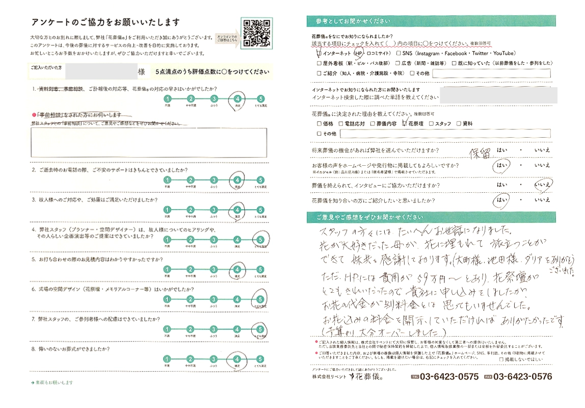 花祭壇のお打ち合わせの時も、使うお花の提案をたくさんしていただけたり、イメージ図のものだと金額的に厳しいことをお伝えすると、削ったものをすぐ提案してくれたり、母の葬儀で色々と悩んでいましたが、金銭的なところを相談しやすいところもよかったです