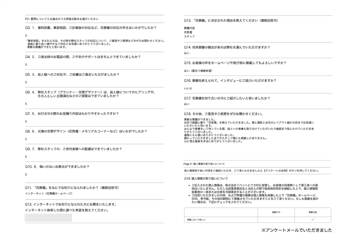 花祭壇のお打ち合わせの時も、使うお花の提案をたくさんしていただけたり、イメージ図のものだと金額的に厳しいことをお伝えすると、削ったものをすぐ提案してくれたり、母の葬儀で色々と悩んでいましたが、金銭的なところを相談しやすいところもよかったです